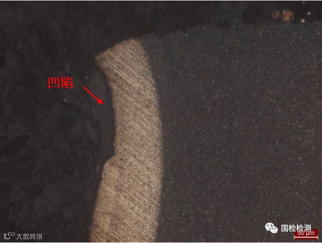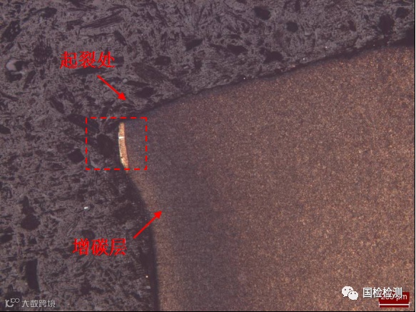 在3#螺栓起裂凹坑处截取纵截面进行金相观察,如图26所示,可见起裂处边缘存在深度约0.1mm的异常组织(方框所示),同时螺栓表面存在深度约0.6mm的增碳层。