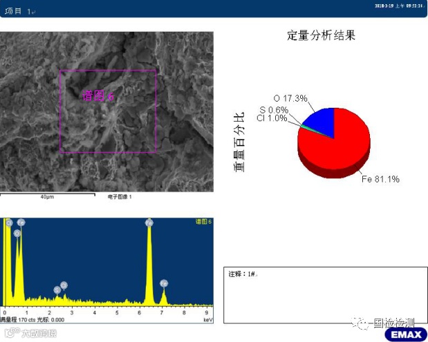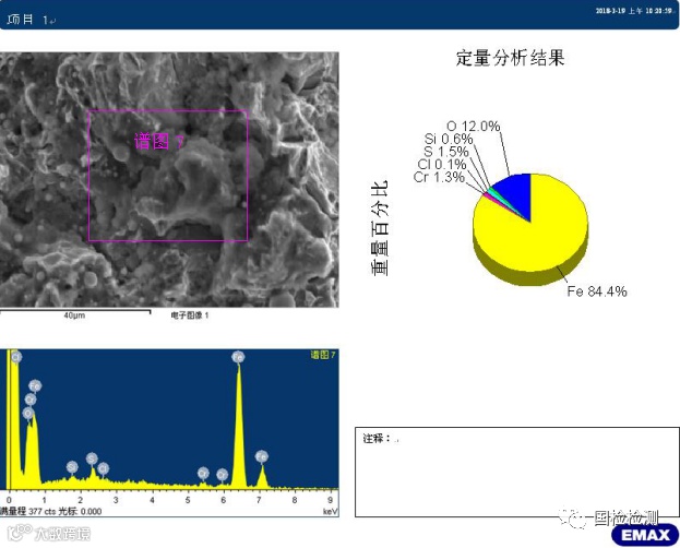 图9所示为C1区微观形貌,可见明显的沿晶形貌+准解理形貌,并伴随晶间二次裂纹,局部区域存在覆盖物。图10所示为C1区能谱分析结果,该区域存在大量氧元素,并存在少量氯、硫等元素。