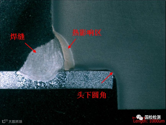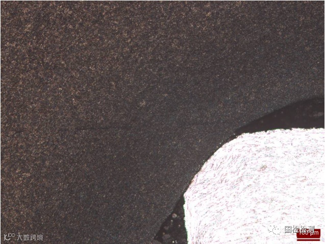 截取完好螺栓头部纵截面进行金相观察,低倍组织如图32所示,头下圆角处金相组织如图33所示,焊接热影响区仅限于头部表面,未影响至头下圆角处,螺栓表面存在明显的増碳层。