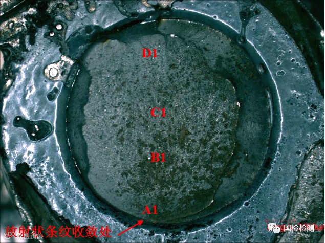 选取具有代表性的两枚螺栓残件2#、3#进行重点分析。图4所示2#断口低倍形貌,断口平整,无明显塑性变形,并可见明显的锈蚀痕迹。断面存在明显的放射状条纹,收敛于断口边缘(箭头所示)。将断口分为A1、B1、C1、D1四个区域进一步描述。