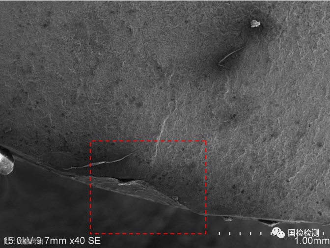 图13所示为A2区低倍形貌,可见断口边缘存在明显的凹坑缺陷。图14所示为A2区微观形貌,断面存在明显的覆盖物,隐约可见沿晶形貌。图15所示为A2区能谱分析结果,可见该区域存在大量氧元素,并存在少量氯、硫、钙、硅等元素。