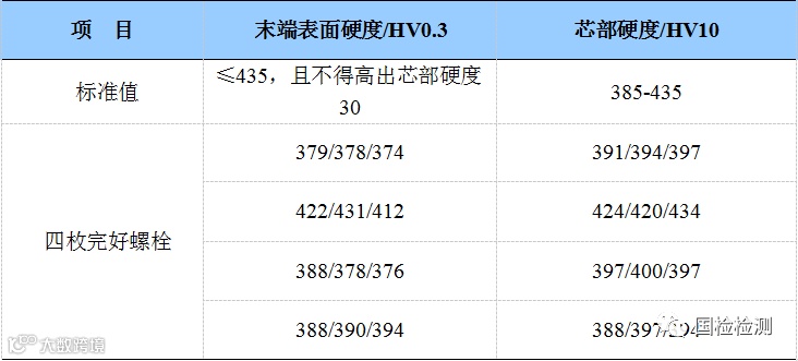 对四枚完好螺栓分别进行表芯硬度测试,结果如表2所示,均符合“GB/T 3098.1-2010”标准中关于12.9级螺栓的相关要求。