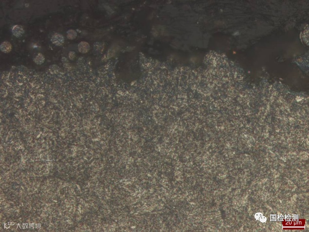 图27所示为3#螺栓起裂处边缘异常组织的高倍形貌,可见该部分显微组织为马氏体,且存在明显的凹陷现象。图28、图29所示为3#螺栓远离断口的杆部表面组织,可见大量的凹坑缺陷,凹坑周围显微组织同样为马氏体。3#螺栓起裂区为杆部,远离螺栓头部与隔板焊接位置,因此该异常组织可能为焊接引起的烧伤组织。