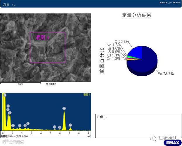 图5所示为A1区微观形貌,断面存在明显的覆盖物,隐约可见沿晶形貌。图6所示为A1区能谱分析结果,该区域存在大量氧元素,并存在少量氯、硫、钠、铬、硅等元素。