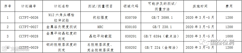 2020年能力验证项目开始啦~本批能力验证计划包括紧固件拉伸、金属材料硬度、金属材料金相等。具体项目及详细信息如下: