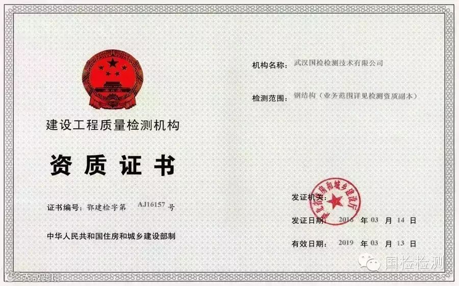 近日,武汉国检公司顺利取得了湖北省住房和城乡建设厅颁发的《建设工程质量检测机构资质证书》