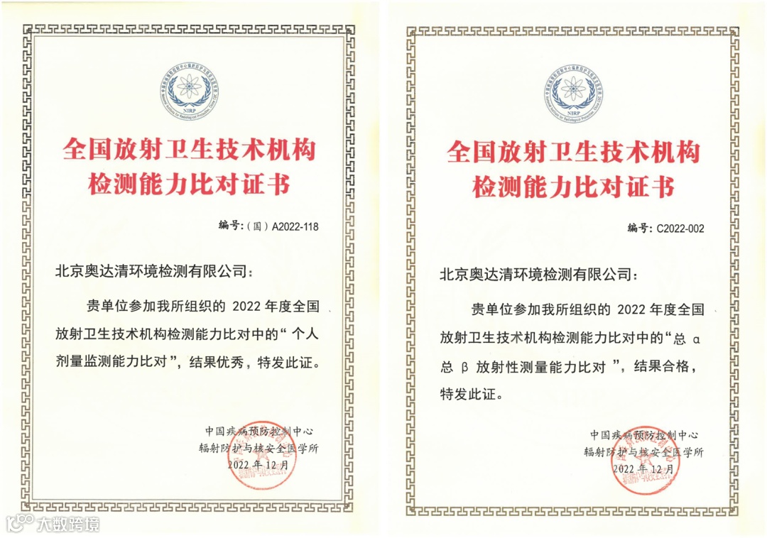 北京奥达清参加由中国疾控中心辐射安全所组织的国家级放射卫生检测能力比对工作,并取得个人剂量监测能力比对“优秀”证书,“总α总β放射性测量能力比对”结果合格。