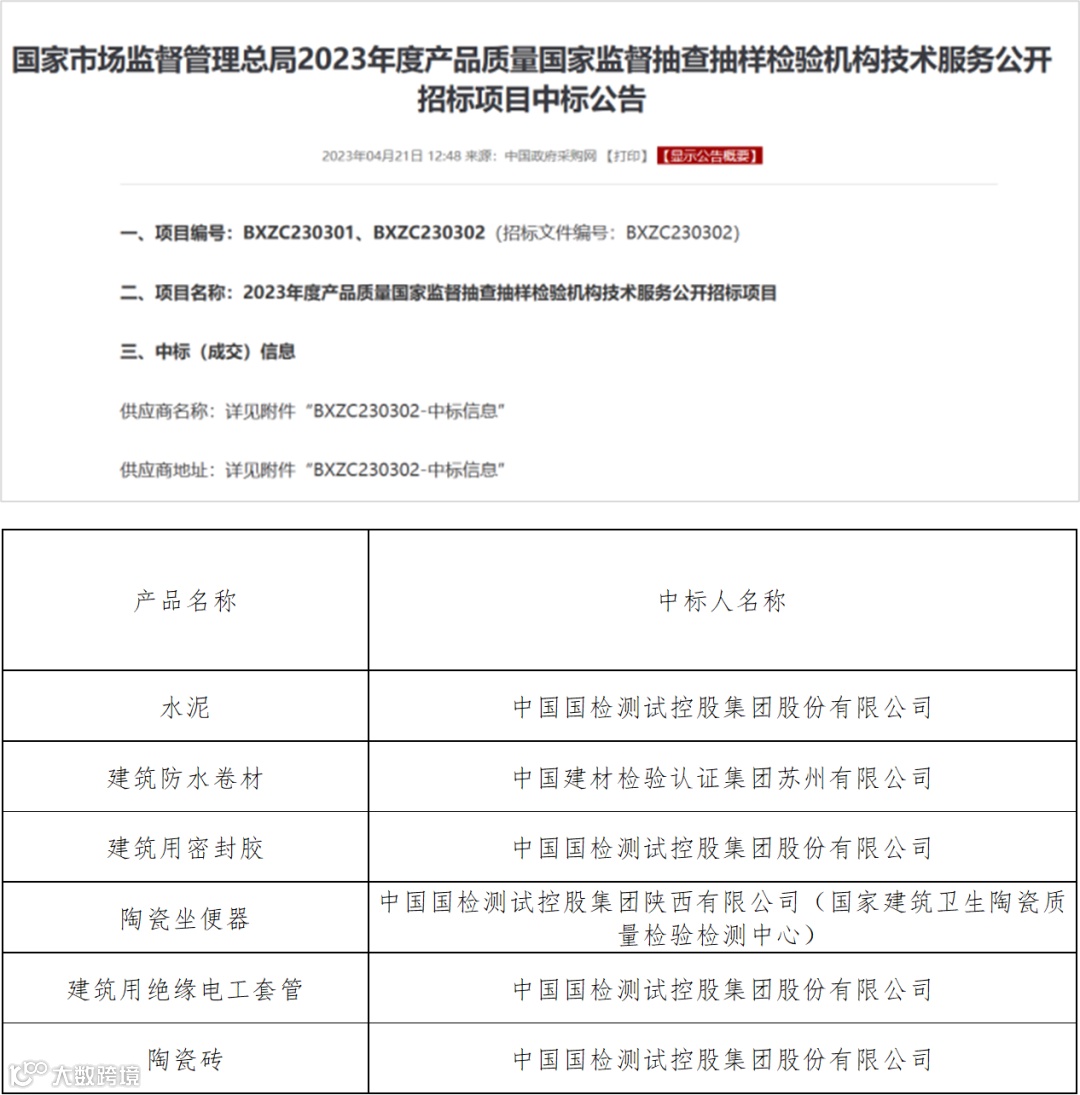 国检集团中标国家市场监督管理总局“2023年度产品质量国家监督抽查抽样检验机构技术服务公开招标项目”,将承担水泥、建筑防水卷材、建筑用密封胶,陶瓷坐便器、建筑用绝缘电工套管,陶瓷砖共6项国家监督抽查工作。