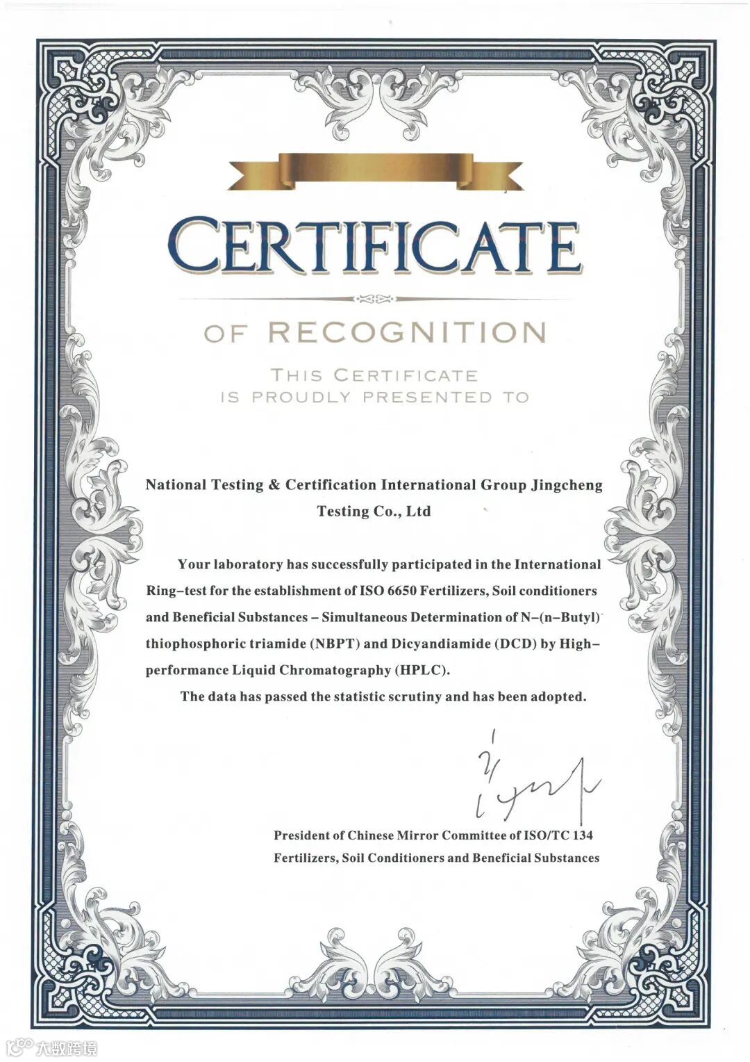 国检京诚参与国际标准ISO 6650 Fertilizers, Soil conditioners and Beneficial Substances-Simultaneous Determination of N- (n-Butyl) thiophosphoric triamide (NBPT) and Dicyandiamide (DCD) by High-performance Liquid Chromatography (HPLC) (中文名称《肥料、土壤调理剂和有益物质 同时测定正丁基硫代磷酰三胺(NBPT)和双氰胺(DCD)高效液相色谱法》)的标准制定循环比对实验,验证该标准方法的精密度,确定该标准方法的重复性限与再现性限。