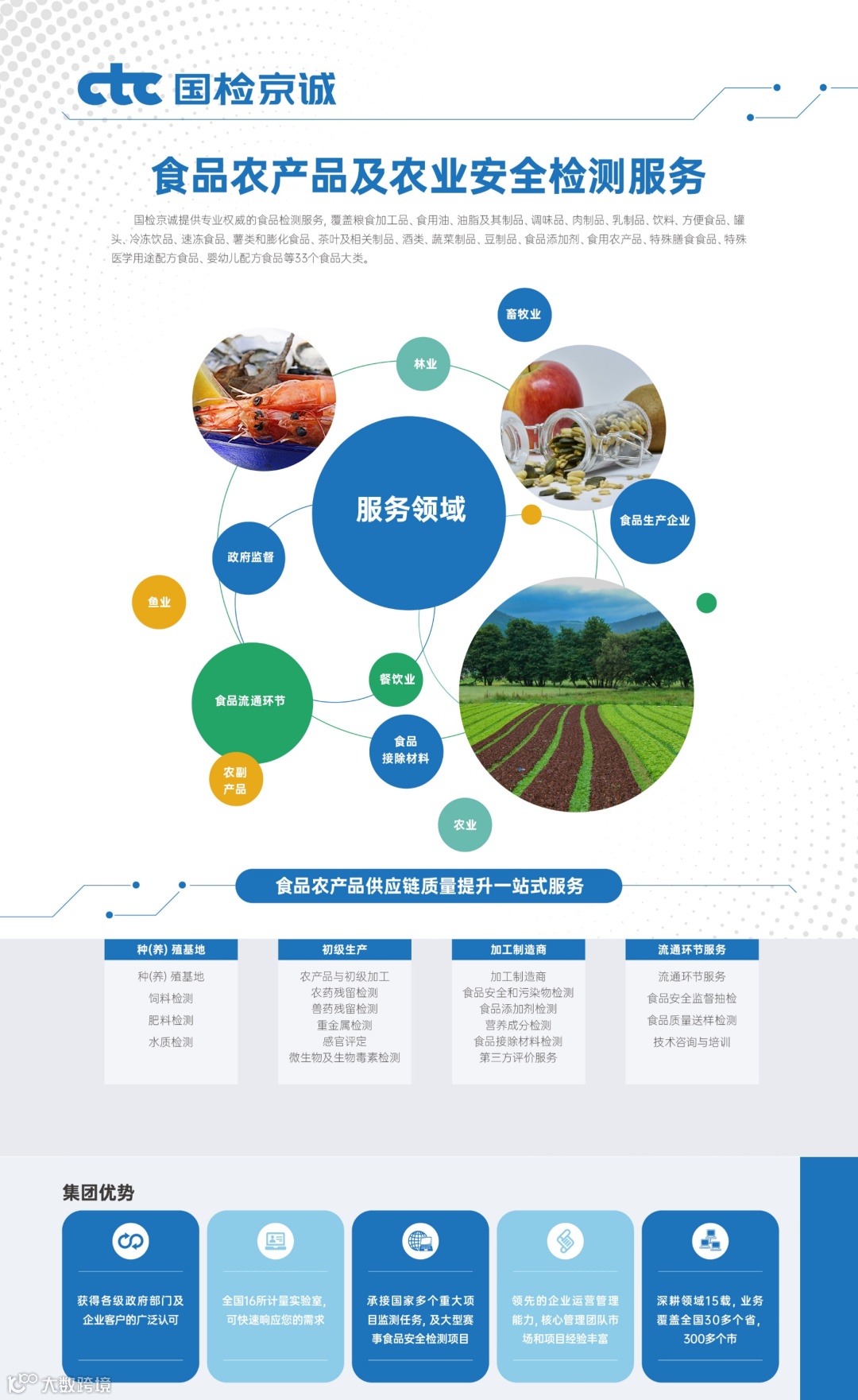 食品安全控制不仅关乎个人健康及食品企业发展,甚至影响国家公共安全体系以及社会稳定。国检京诚集团为您提供专业权威的食农产品安全检测服务(含食品接触材料、保健品、药品),集团长期承担生产、流通、餐饮等食品安全检测服务项目,是多省市食药监部门合作单位。如有相关检验检测需求,请拨打集团热线400-8894-222或登录官网www.beijingtest.com查询。