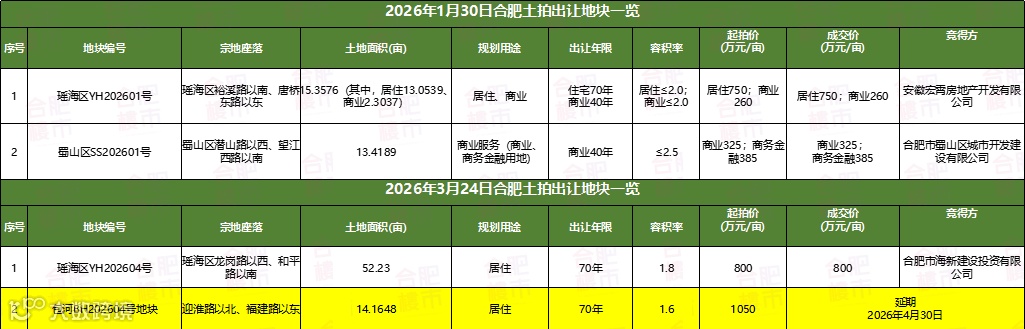 随着3月27日最后一声拍卖槌响,合肥2026年一季度的土地市场正式落下帷幕。三轮土拍,总计12宗地块成功出让,无一例溢价,全部平稳成交。从年初瑶海、蜀山两宗地块的国资托底,到3月底8宗地齐发、揽金8.88亿元的收官,一季度土拍清晰勾勒出当前市场的“底色”:理性、分化,国资主导。