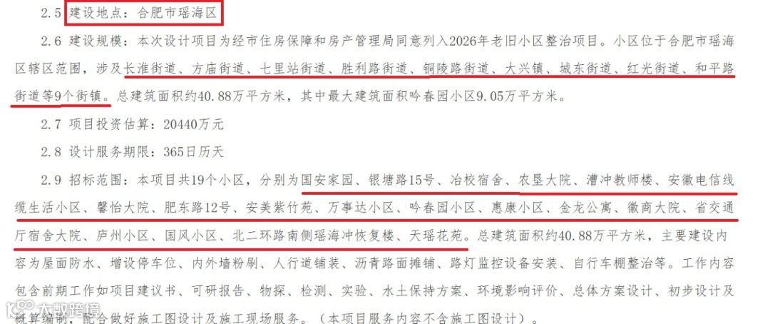 3月17日,一则来自安徽合肥公共资源电子交易系统的招标公告,在合肥城建领域投下了一枚重磅消息。瑶海区2026年老旧小区整治项目设计单位招标工作正式启动,标志着一项总投资2.044亿元、覆盖9个街镇、19个老旧小区、总建筑面积约40.88万平方米的庞大民生工程,从规划步入实质性推进阶段。资金已100%落实,一场聚焦老城区人居环境“精细织补”的升级战役,已然打响。