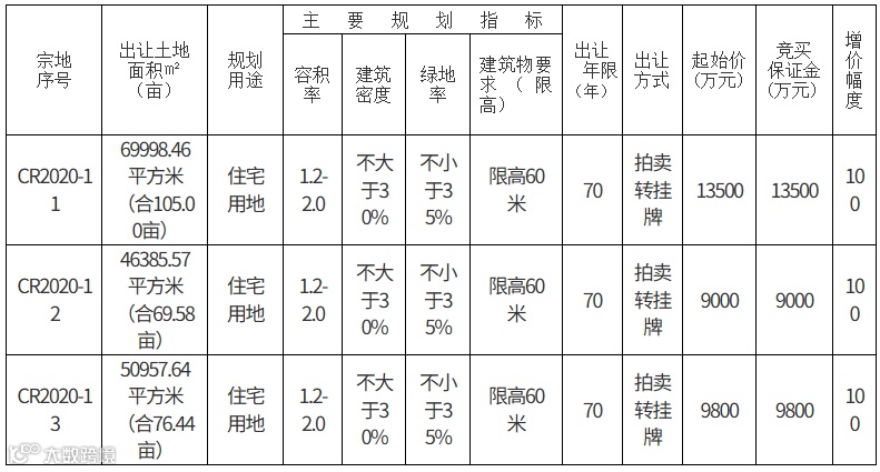 CR2020-12号地块面积69.58亩,位于定城镇岱山路与东兴路交叉口西北角,四至范围东至岱山路道路红线,西至空地,南至东兴路道路红线,北至规划支路道路红线。起始价9000万元,竞买保证金9000万元。