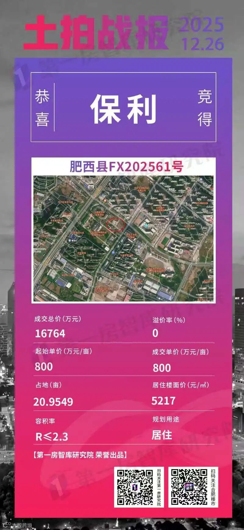 在本次成交的三宗地中,肥西县FX202561号地块的受让方“保利发展”无疑是最受瞩目的名字。这家位列房地产行业“前三甲”的央企巨头,以总价约1.68亿元,成交单价800万元/亩,零溢价的底价条件,将这块约21亩的住宅用地收入囊中。