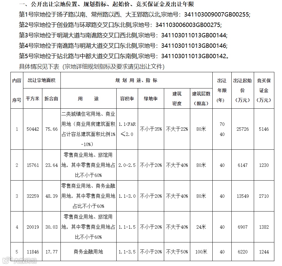 这宗地块编号341103009007GB00255,面积50442平方米(约75.66亩),规划用途为二类城镇住宅用地兼容商业,商业用房建筑面积占计容总建筑面积比例控制在1%-10%之间。