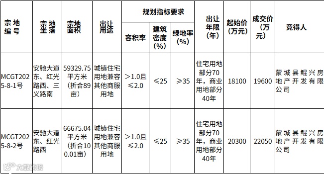 近日,安徽省蒙城县自然资源和规划局发布了一则重磅公告:2025年12月16日,两宗位于安驰大道东侧的优质国有建设用地使用权以拍卖方式成功出让,总成交价高达4.165亿元!这不仅是蒙城县2025年度土地市场的压轴大戏,更是中心区产城融合发展的关键落子。其中,MCGT2025-8-1号地块以19600万元成交,MCGT2025-8-2号地块以22050万元斩获,均被蒙城县鲲兴房地产开发有限公司收入囊中。这一数据背后,折射出蒙城作为皖北枢纽城市的巨大潜力。
