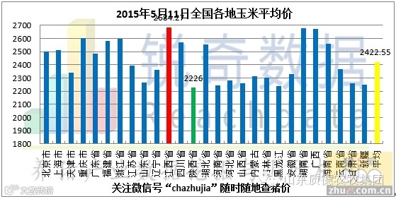 据猪e网锐奇数据检测当地玉米报价信息统计,2015年05月11日国内各地玉米平均价格为2428.63元/吨,较昨日(05月10日)2422.20元/吨上涨6.43元/吨,涨幅为0.27%。据此次检测的省市中,最高价格为江西省2684.27元/吨,最低价格陕西省2226.00元/吨(以上价格均已换算成含水分为14%的标准玉米)。