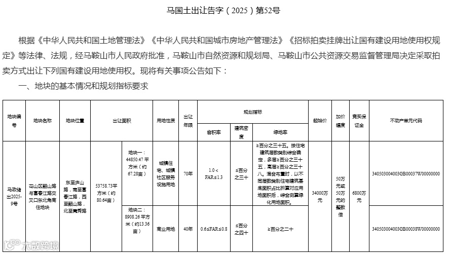 2025年10月10日,马鞍山市自然资源和规划局联合市公共资源交易监督管理局发布一则土地出让公告(马国土出让告字〔2025〕第52号),正式挂牌一宗编号为“马政储出2025-9号”的国有建设用地使用权。该地块位于花山区韶山路与富春江路交汇处,总面积约80.64亩,起始价3.4亿元,计划于11月3日以拍卖方式公开出让。作为2025年市级经营性用地供应计划中的重点地块,其推出不仅标志着马鞍山土地市场持续稳健推进,更折射出城市在“生态福地、智造名城”目标引领下的空间优化和功能提升意图。