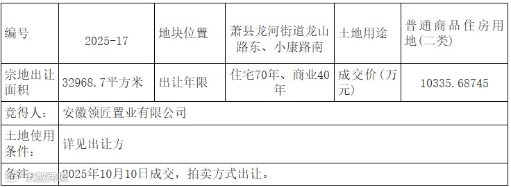 安徽领匠置业有限公司竞得一宗涉宅用地,共49亩