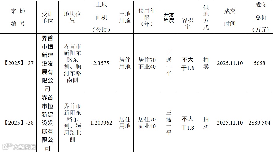 根据界自然资公告字﹝2025﹞30号公告之规定,我局于2025年10月16日至2025年11月10日通过拍卖方式成交两宗国有建设用地使用权。现将成交结果予以公示: