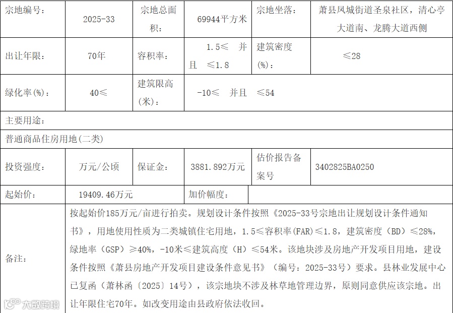 六、 本次拍卖出让的详细资料和具体要求,见出让文件。申请人可于2025年11月27日至2025年12月 17日17时00分前,按照出让文件要求上传报名材料。