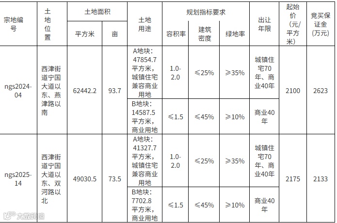 ngs2024-04号地块位于西津街道宁国大道以东、燕津路以南,出让面积62442.2平方米, 不动产单元号:341881001077GB00023W0000000;ngs2025-14号地块位于西津街道宁国大道以东、双河路以北,出让面积49030.5平方米, 不动产单元号:341881001077GB00033W00000000。以上两宗地块的建设要求需严格按照宗地规划设计条件执行(详见出让文本)。
