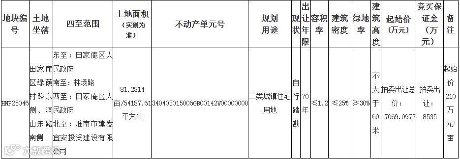 五、拍卖时间和地点:本次国有建设用地使用权拍卖会定于2025年12月19日16:00在淮南市公共资源交易中心一楼开标四室(山南新区政务中心F楼)举行。