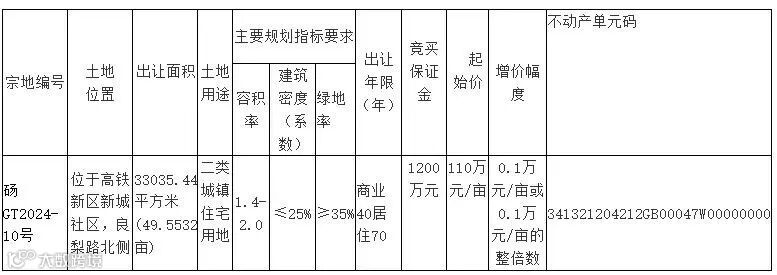 砀山县将于6月11日出让砀GT2024-10号地块,位于高铁新区新城社区,良梨路北侧,面积49.5532亩,规划用途二类城镇住宅用地,起拍单价110万元/亩,竞买保证金1200万元。