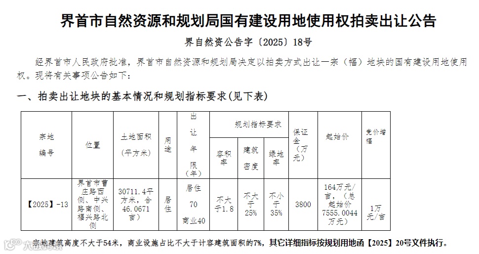 2025年9月11日,界首市自然资源和规划局发布一宗国有建设用地使用权拍卖出让公告,地块编号【2025】-13,位于曹庄路西侧、中兴路南侧,总面积46.0671亩,规划为居住兼容商业用途,起始价164万元/亩。该地块的推出,标志着界首在国土空间规划引领下,城市发展迈入实质性推进阶段。