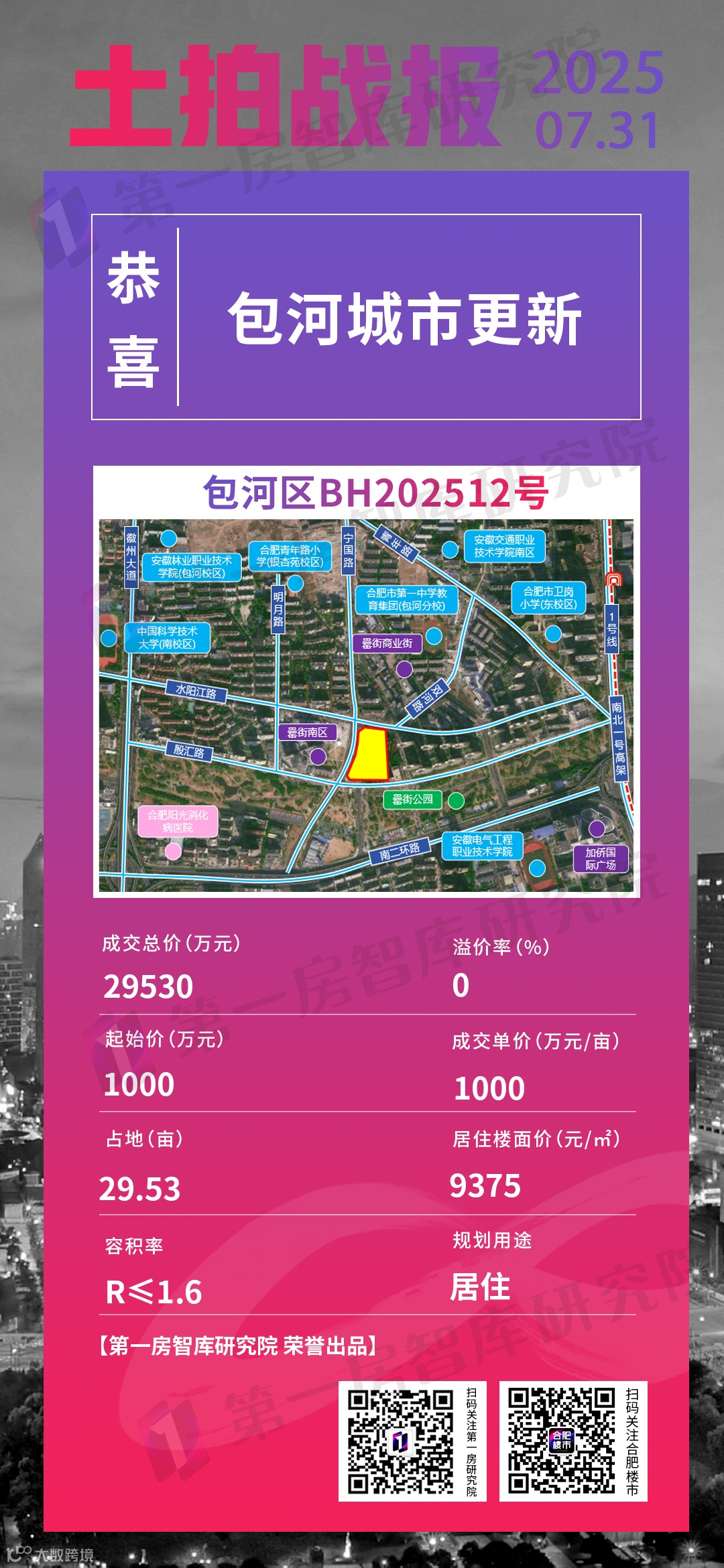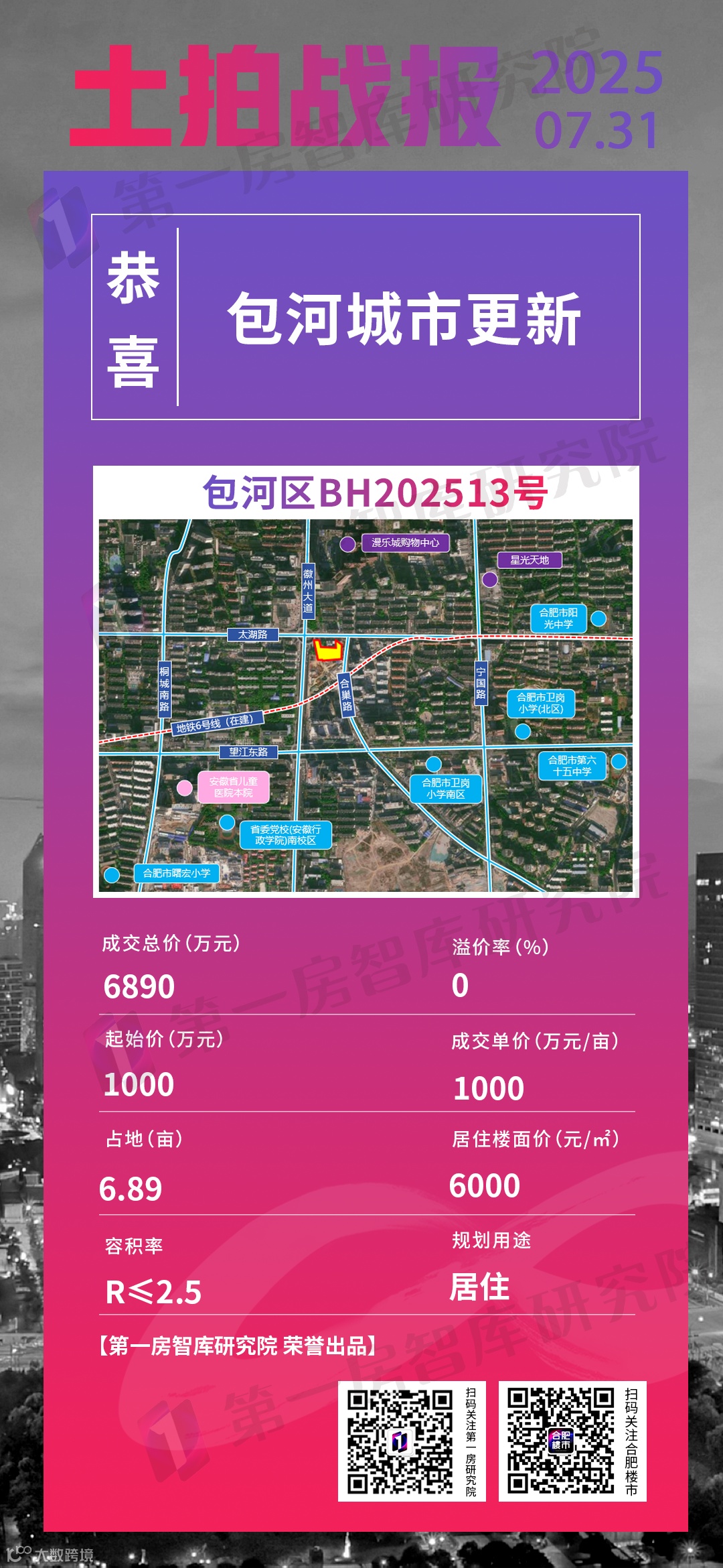 地块位于包河区太湖路以南、徽州大道以东,规划居住用地,面积6.89亩,容积率2.5,包河城市更新以1000万元/亩竞得,成交总价6890万元,成交楼面价6000元/㎡。