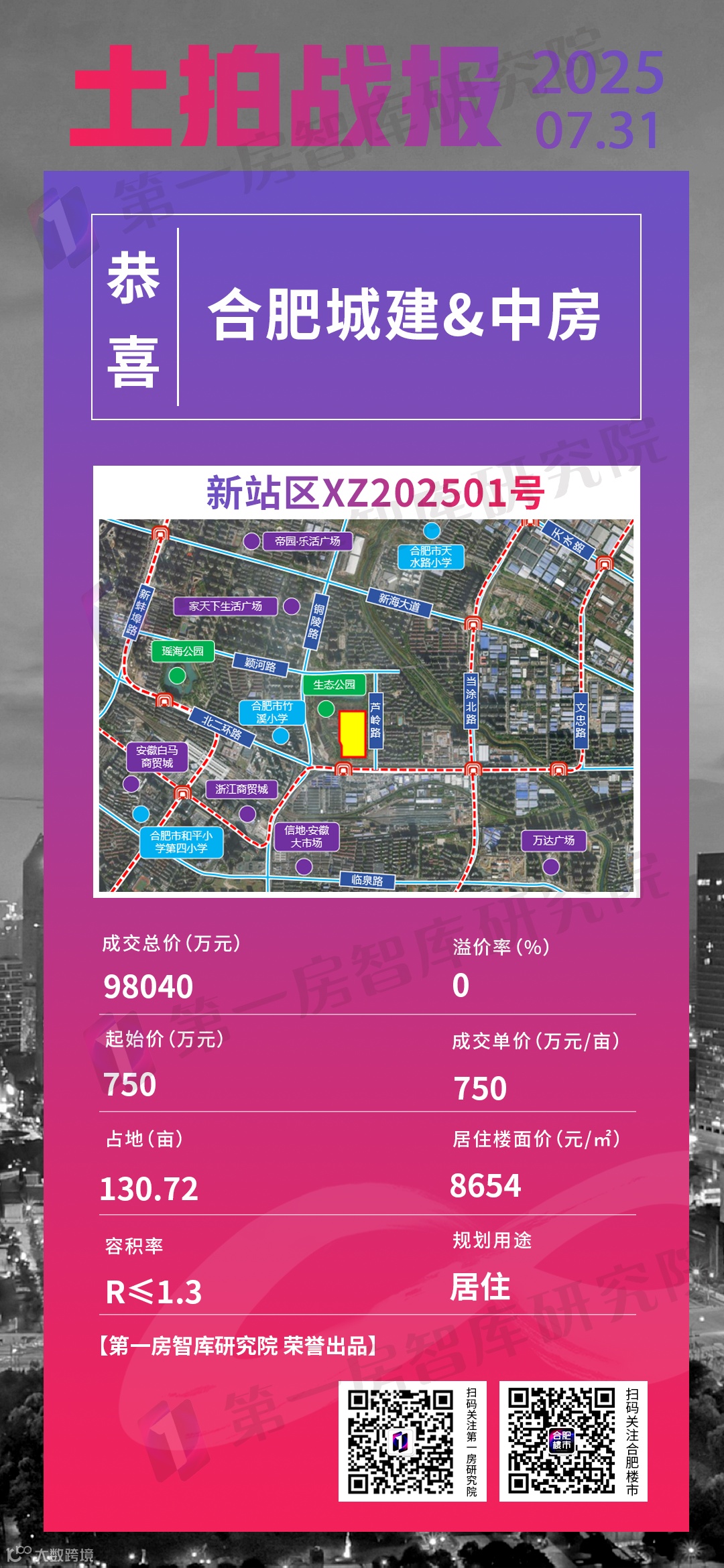 地块位于北二环路以北、芦岭路以西,占地130.72亩,容积率1.3,合肥城建+中房以底价竞得,成交单价750万元/亩,成交总价9.8亿元,成交楼面8654元/㎡,溢价率0%。