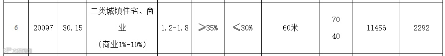 6号宗地位于紫薇路与玉兰路交叉口西北侧,占地面积20097㎡,规划用途二类城镇住宅、商业(商业1%-10%),容积率1.2-1.8,绿化率≥35%,限高60米,使用年限70/40年。