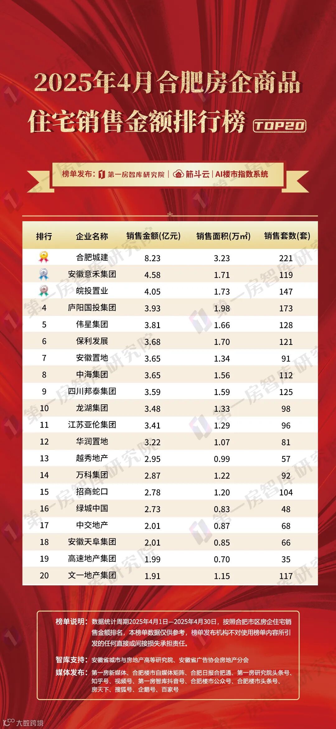合肥城建**以8.23亿元销售额、3.23万㎡面积稳居第一,本土国企深耕优势尽显;