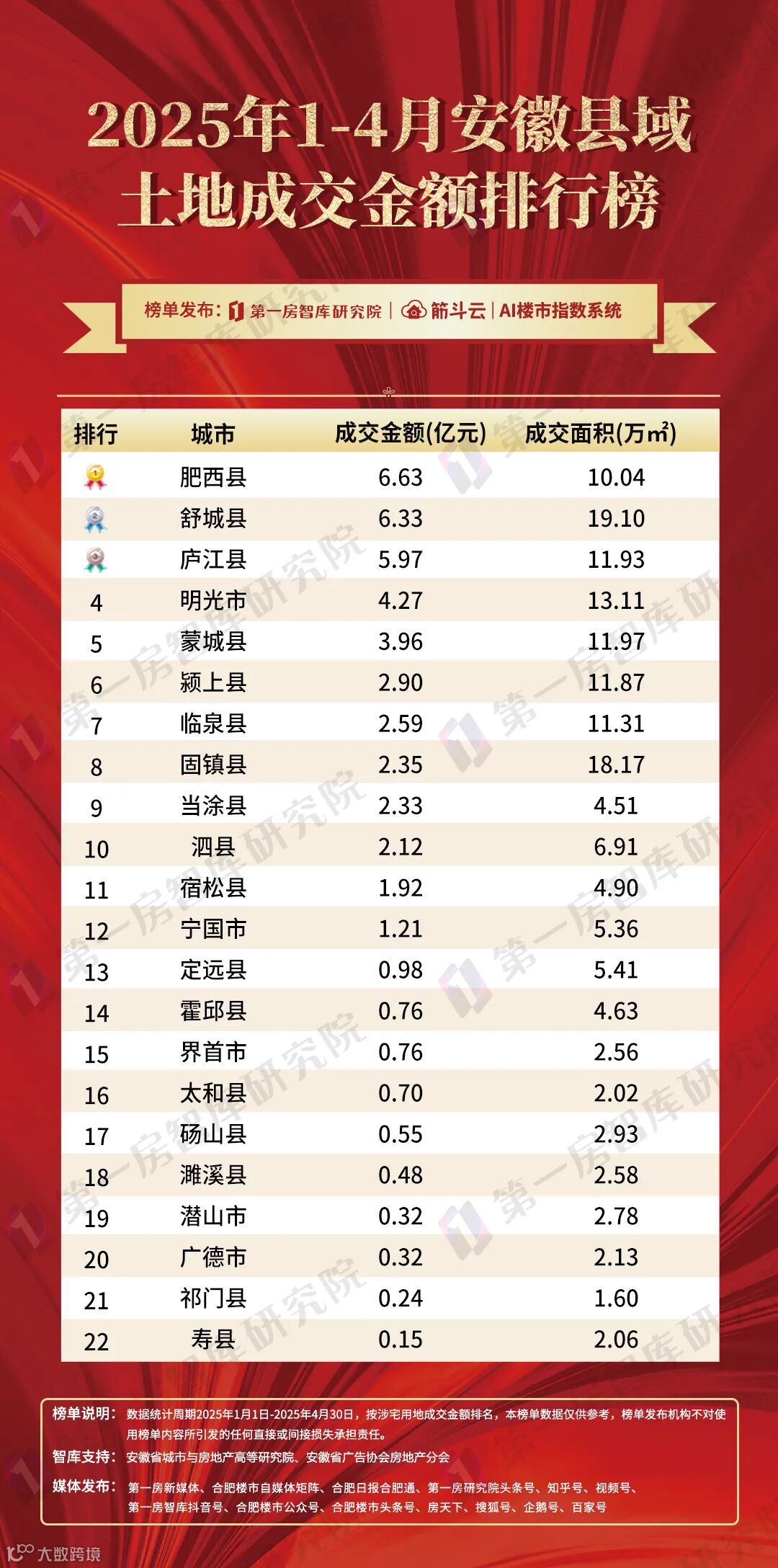 舒城县(6.33亿元)、庐江县(5.97亿元)紧随其后,县域经济与文旅资源助推土地价值;