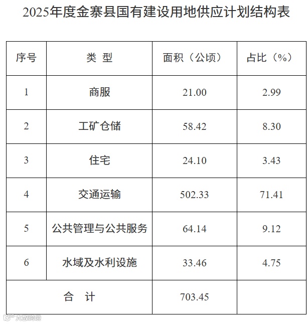2025年度全县国有建设用地供应计划703.45公顷,在各类用地的供应上有着精细的安排。