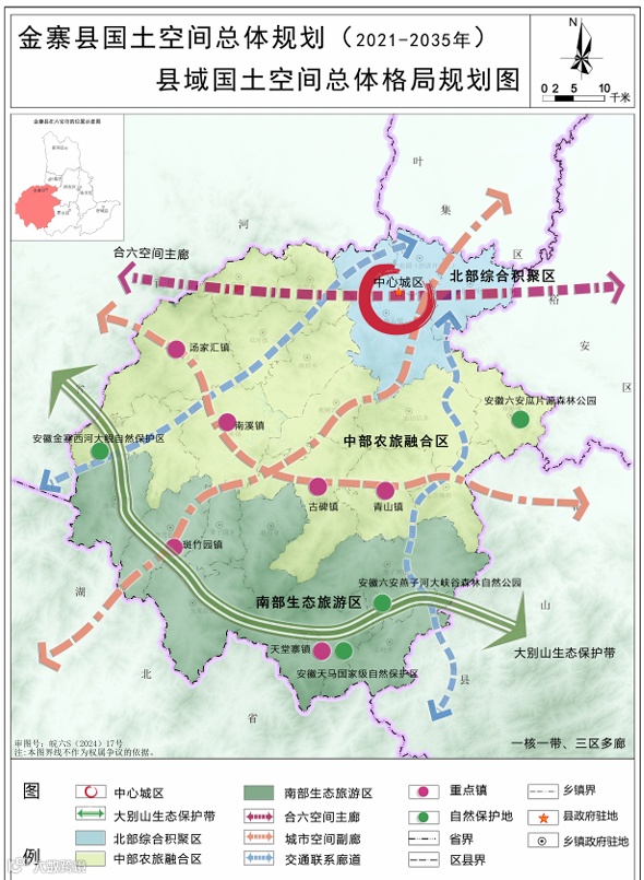 在城镇空间布局上,金寨县致力于强化集约集聚,优化城乡空间布局。以县城为引领,六个重点镇支撑,交通轴线串联北、中、南三大片区,形成 “一心五轴六点” 的多中心网络化开放式集约型城镇空间格局。这种格局的形成,将促进人口和产业向优势区域集中,加强县城中心城区和镇区建设。