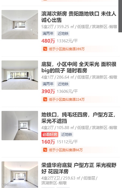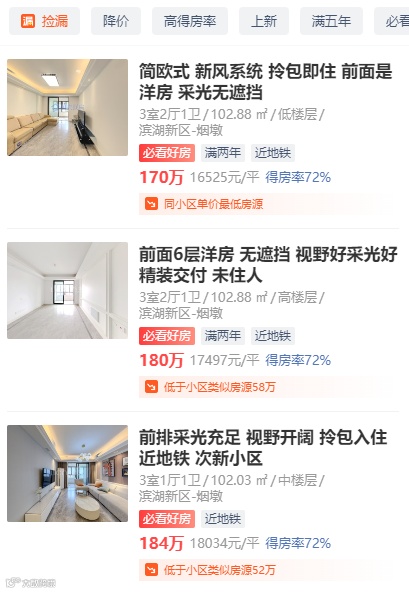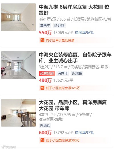 滨湖荣盛华府最低挂牌价仅1.3万/㎡,而100平米左右房源挂牌价在1.5万/㎡又有很多选择。