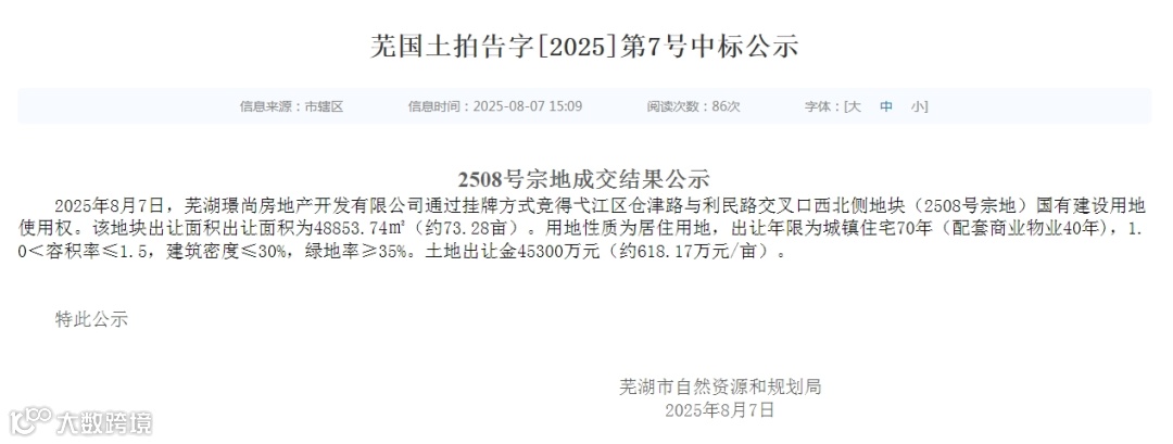 2025年8月7日下午,芜湖土地市场再掀波澜。芜湖璟尚房地产开发有限公司以45300万元成功竞得弋江区仓津路与利民路交叉口西北侧地块(2508号宗地)。