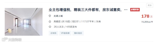 即便是瑶海老城次新房,整体的挂牌价格也相对较低。比如龙湖上城一套117.07㎡户型房源,挂牌价仅1.5万/㎡,该项目今年才交付,还未满两年,该项目新房成交价格1.8-2万/㎡,挂牌价格已经破发,就按照最低1.8万/㎡计算,已经亏本3000元/㎡,算下来亏本35万,同时业主还包未满两年的增值税,再算上房贷利率,里里外外这套房源亏本约45万。