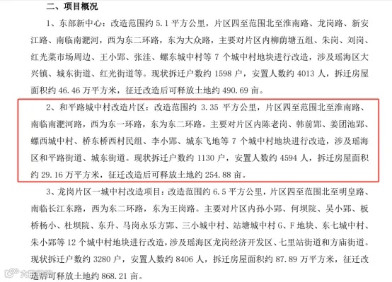 和平路城中村改造片区:改造范围约 3.35 平方公里,片区四至范围北至淮南路、南临南淝河路,西为东一环路,东为东二环路。主要对片区内陈老岗、韩前郢、姜团池郢、螺西城中村、桥东桥西村民组、李小郢、城东飞地等 7 个城中村地块进行改造,涉及瑶海区和平路街道、城东街道。现状拆迁户数约 1130 户,安置人数约 4594 人,拆迁房屋面积约 29.16 万平方米,征迁改造后可释放土地约 254.88 亩。