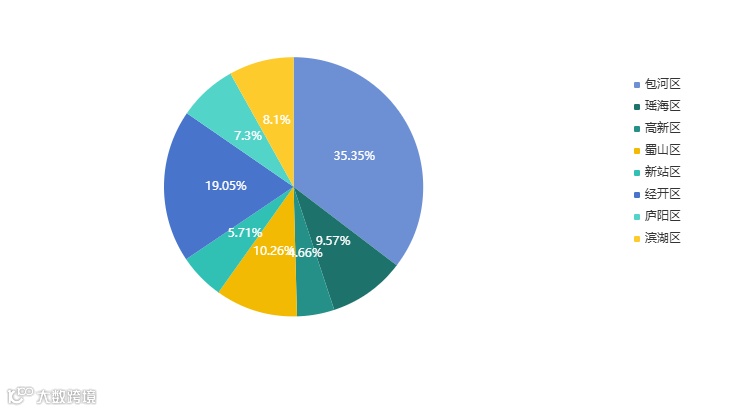 分区域来看,包河区成交面积占比35.35%,九区排名第一。经开区成交面积占比19.05%,排名第二。蜀山区成交面积占比10.26%,排名第三。