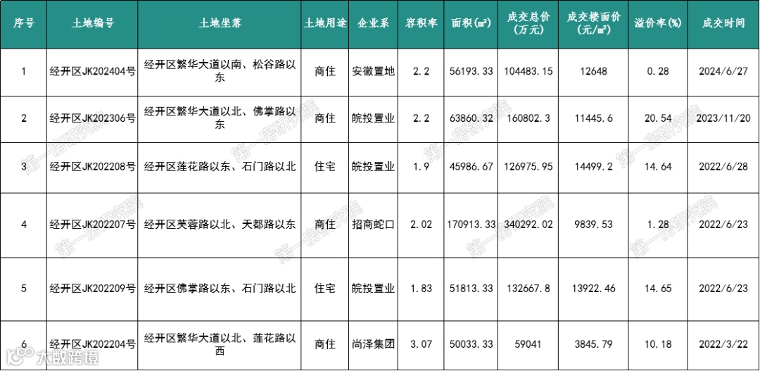 从近3年明珠广场板块土地出让情况来看,共计成交6宗涉宅用地,土地市场在2022年较为活跃,出让了4宗地块,而2023年和2024年各出让了一宗地块,其中皖投经开06号地块是经开区单价地王,溢价率突破20%。
