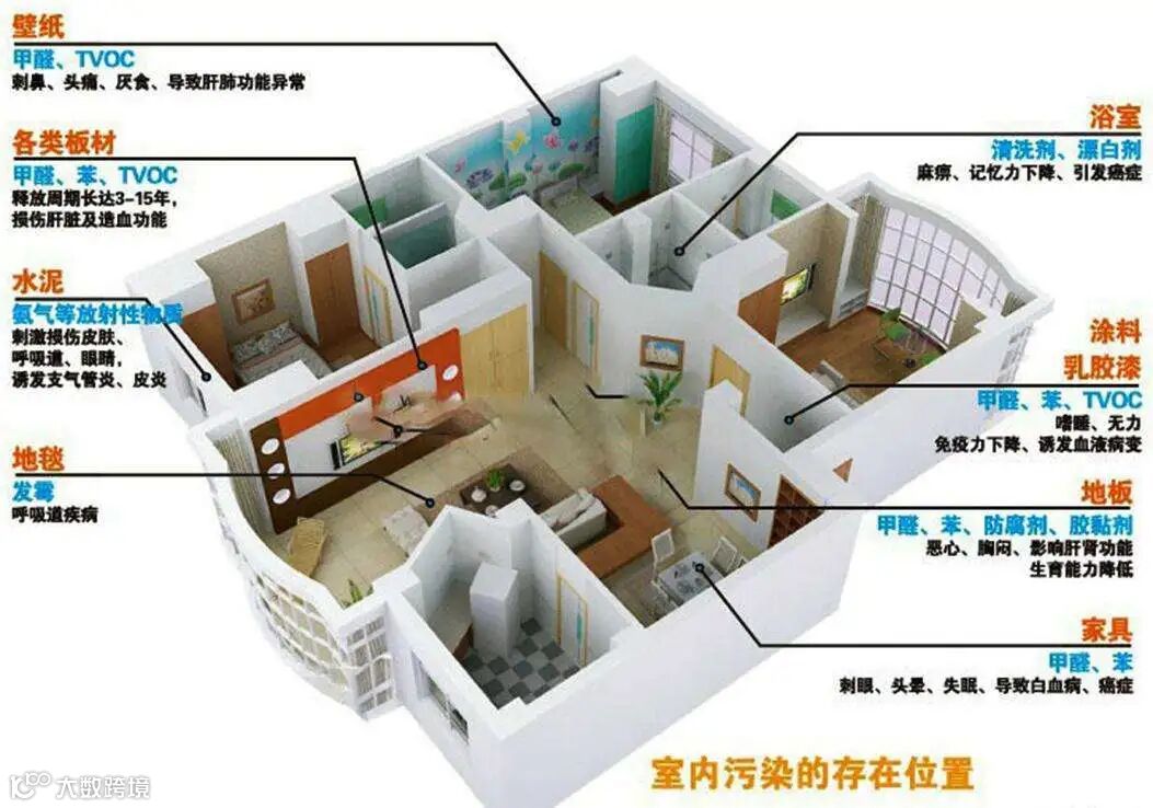 例如,化纤类壁纸可释放出甲醛,塑料壁纸则会释放甲醛、苯等;化纤地毯可释放甲醛、丙烯等;人造板材及人造板家具更是污染“重灾区”,粘接人造板材的黏合剂以及家具表面的油漆中常含有甲醛等大量有机挥发物,会持续不断释放。