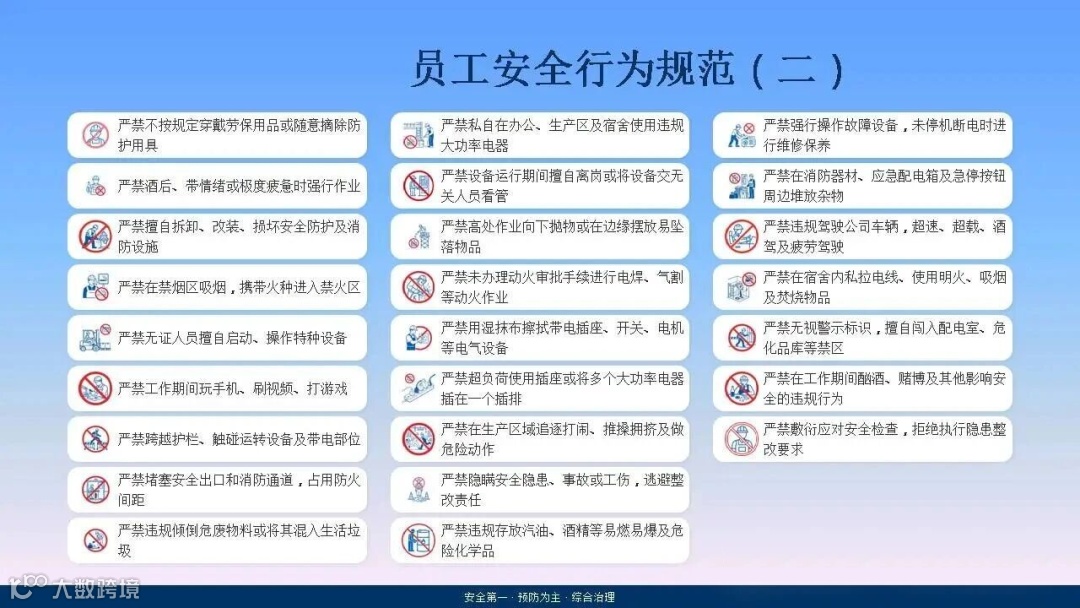 49. 严禁在工作期间酗酒、赌博,不做任何影响自身和他人安全的违规行为。