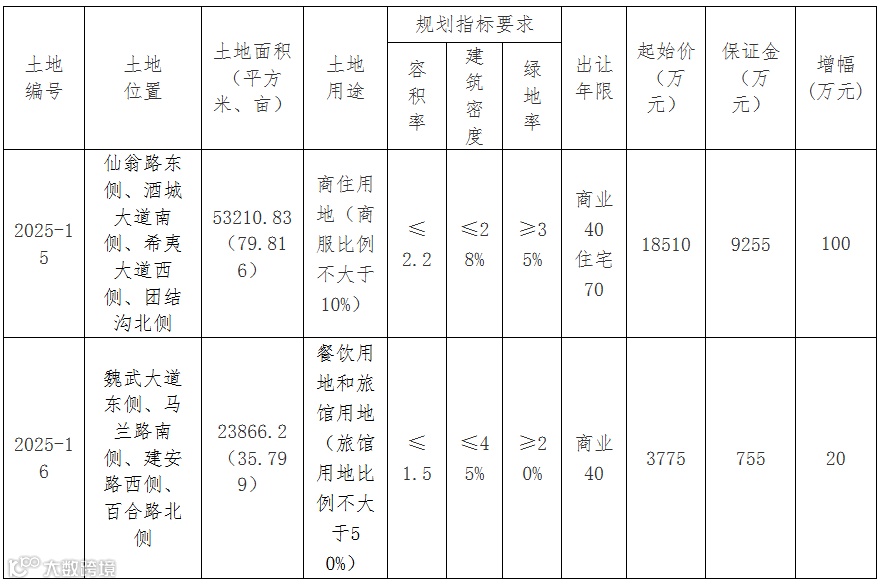 (七)以上出让宗地竞得人须在土地出让合同签订之日起6个月内动工,2025-15号出让宗地建设周期为36个月、2025-16号出让宗地建设周期为24个月。