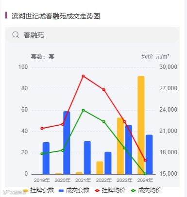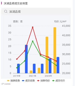 再来看看整个滨湖区二手房价格,2021年成交价格涨到2.7万/m²,随后2022年小幅度的下降,均价2.68万元/m²。然后就是两年的下跌,现在均价只有1.9万/m²。2024年的价格相当于回到了2019年的价格。