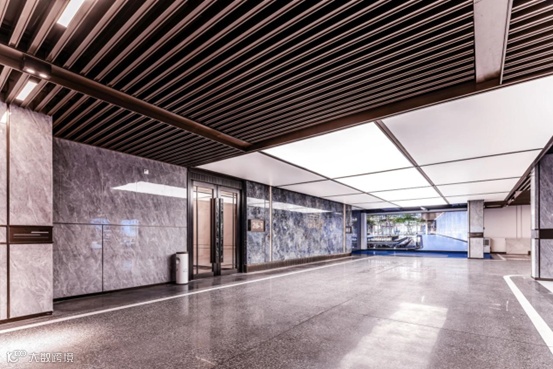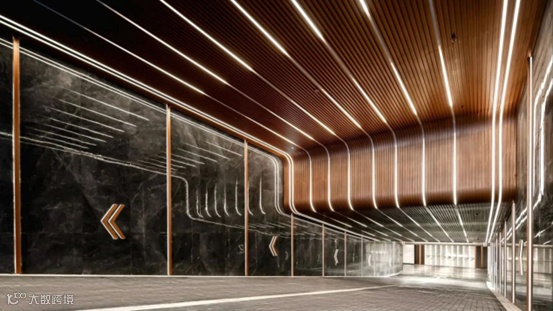 地下车库作为项目的重要组成部分,同样没有被忽视品质与细节。地库设计灵感来源于巢湖之水,以“流水”为主题,将弧形的线条进行艺术化处理,打造出流光坡道的独特景观。地下车库入口一侧景墙采用爱马仕灰进口纯天然石材,搭配四季交叠的绿植与天然山水石,营造出一种高级而自然的氛围。车道吊顶采用玫瑰金色金属格栅及明亮流光灯,下坡处地面采用密拼马蹄石,既美观又降低了胎噪。主行车道采用水磨石工艺,耐磨耐压、防滑性能好,顶部吊顶则采用金属格栅+LED灯,营造出一个舒适、安全和美观的停车环境。
