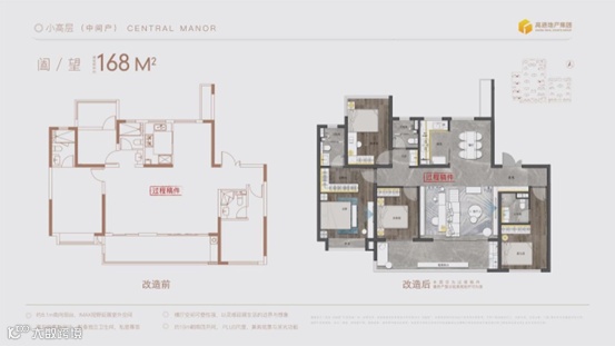 168㎡中间户,设计为四室两厅一厨三卫,拥有约15米朝南四开间,约8.1m南向阳台,IMAX视野延展室外空间。