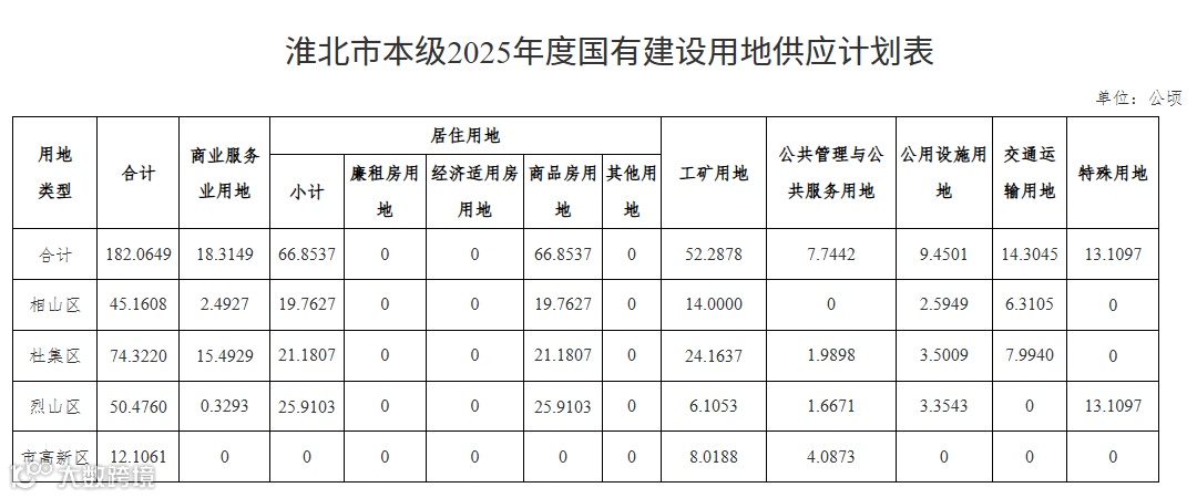与此同时,住宅用地66.8537公顷(占36.72%)的庞大规模,直指人口导入和城镇化加速。值得注意的是,住宅用地中100%为商品房用地,零保障房供应。这一方面反映淮北房地产市场仍以商品化为主导,另一方面也提示未来需关注刚需群体的住房配套政策是否跟进。