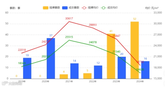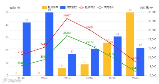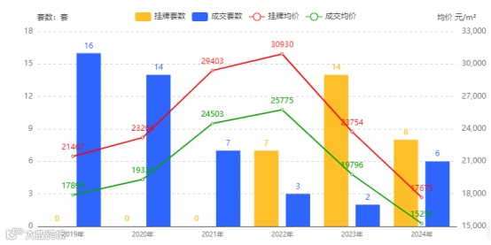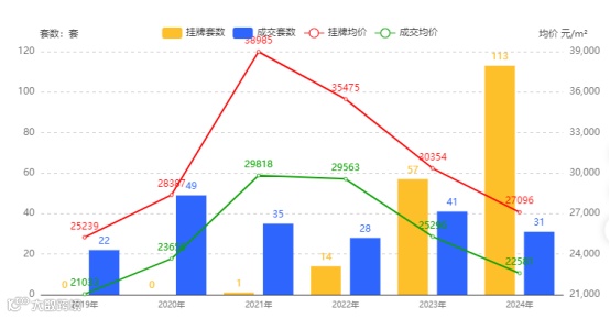 同样中海滨湖公馆2021年挂牌价格冲高到约3.9万/㎡,成交价格也直逼3万/㎡,但随后市场下行,挂牌价格大幅下跌,成交价格同样下跌,今年成交价格2.2万/㎡,与2019年价格相差不大。